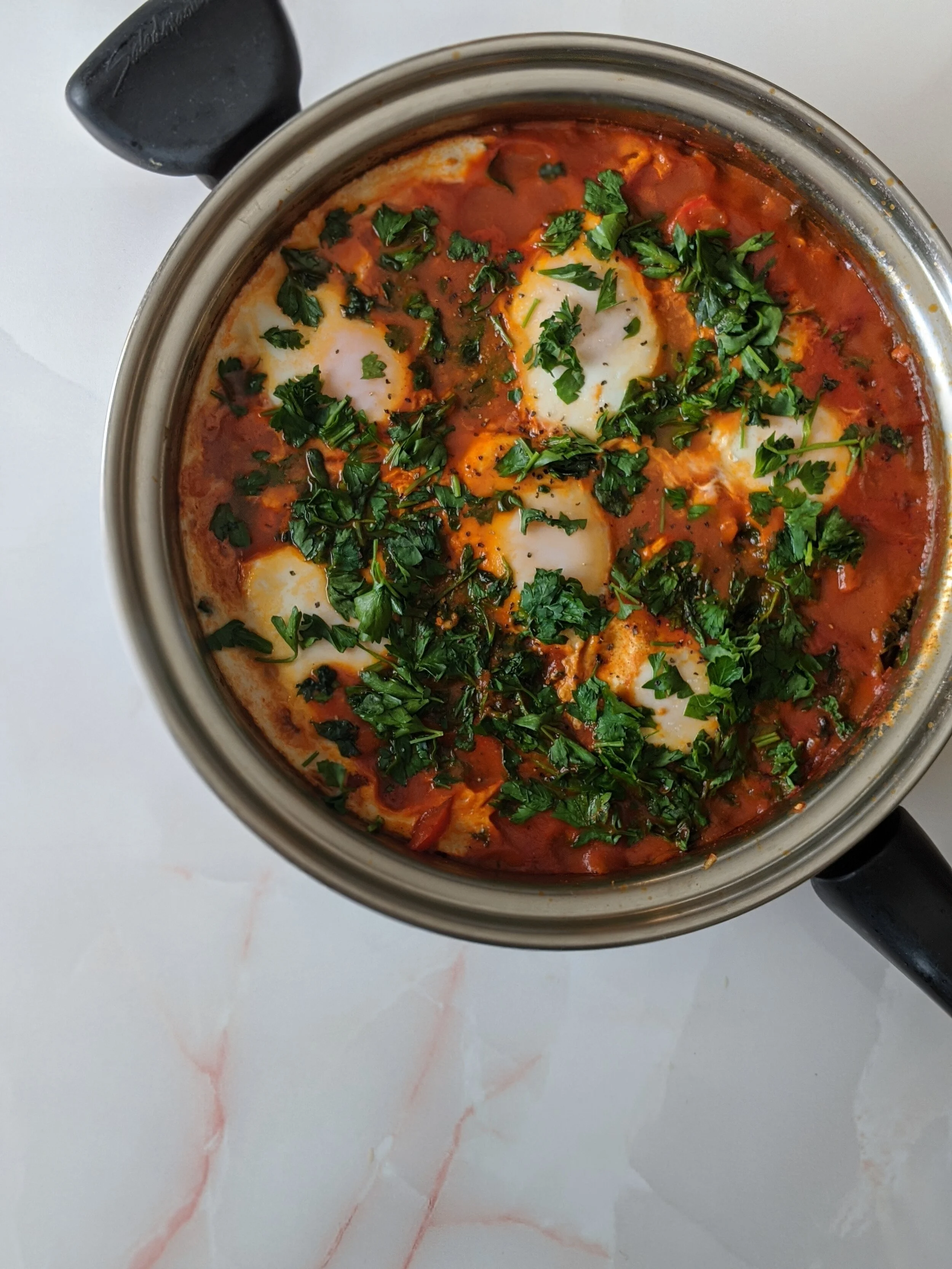 Using your spoon, make small wells in the sauce and crack the eggs into each well. Cover the pan and cook for about 5-10 minutes, or until the eggs are done to how you like them.